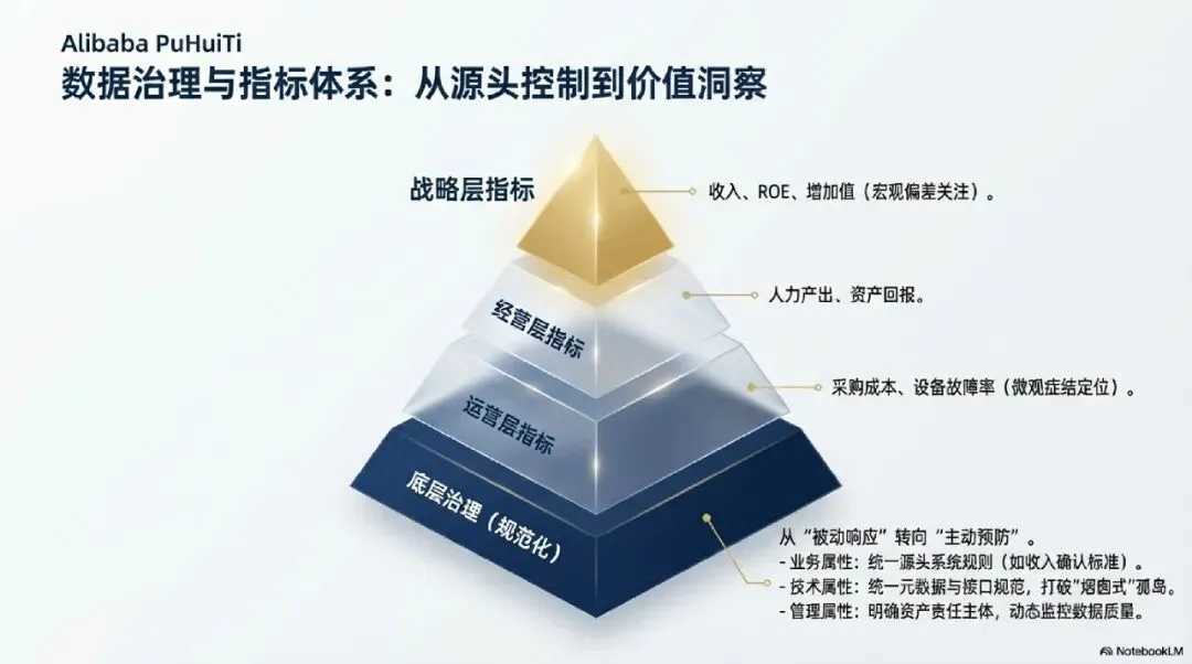 数据治理是穿透式监管的底座。治理过程需符合“业务与数据价值链架构” :业务属性:数据必须支撑业务流程的完整流转,例如收入确认规则必须在源头系统统一。技术属性:制定统一的元数据标准和接口规范,打破“烟囱式”架构,确保数据在集团内部“说同一种语言”。管理属性:明确数据资产的责任主体,建立数据质量的动态监控机制。推动治理模式从“被动响应”向“主动预防”转变 。6.3 构建指标体系应用核心