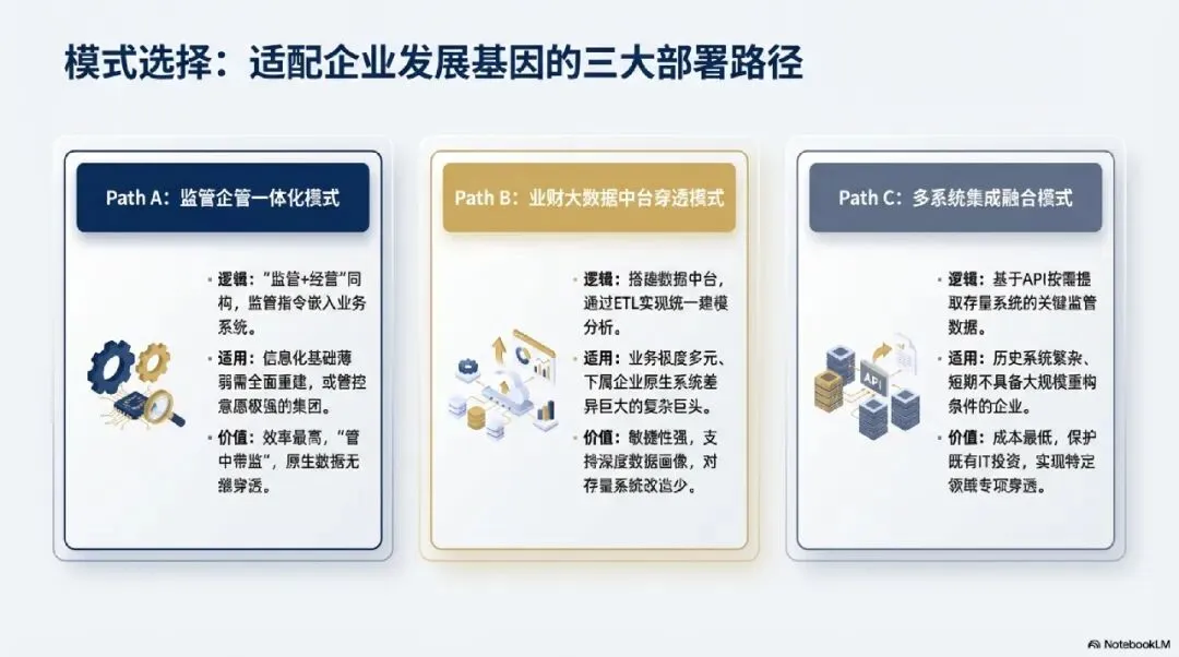 顶层设计:统一制度保障,明确各层级的授权清单与数据标准 。技术筑基:建设智能监管云平台,利用大数据、AI、区块链技术整合全域数据 。组织协同:纵向落实全级次责任体系,横向打破部门隔阂,组建跨职能监管专班 。场景化应用:从单一指标监测向复杂的动态风险画像、AI自动化审核场景延伸 。能力建设:提升各级干部的“数字素养”,确保监管工具能够被有效运用 。7.2 三大落地模式策略对比