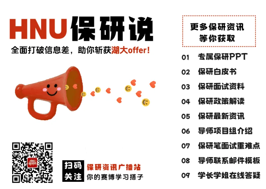 湖南大学各学院推免细则、拟录取名单、保研常识扫盲、保研硬件&软件准备、文书准备、复试考核对策、保研四年规划。