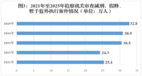 3. 刑事执行监督保持较高质量。全国检察机关受理审查减刑、假释、暂予监外执行案件328276人(见图3),提出书面纠正违法3216人、检察建议3153人。针对刑罚执行和监管活动提出监督意见45861件。针对监外执行监管活动提出监督意见41249人。针对财产性判项执行提出监督意见3.1万件。针对监狱、看守所分别开展巡回检察580次、1255次。