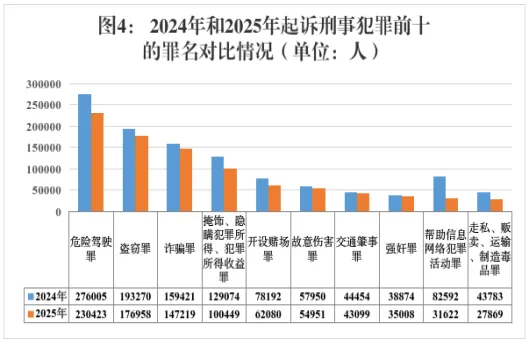 2. 影响人民群众安全感的常见多发犯罪数量下降明显。起诉故意伤害罪、盗窃罪等影响人民群众安全感的多发犯罪846036人[2],同比下降11%。起诉危害安全生产犯罪4494人,同比下降15.1%。起诉拐卖、收买妇女儿童犯罪1035人,同比下降18.4%,为近十年来最低。起诉毒品犯罪33456人,同比下降36%,近十年来毒品犯罪呈明显下降趋势。其中,起诉犯罪前十的罪名包括危险驾驶罪、盗窃罪、诈骗罪等,合计占起诉总数的64.8%(见图4),均不同程度呈下降态势。