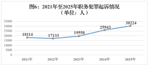 5. 协同推进反腐败斗争不断深化。起诉职务犯罪30224人[5] ,同比上升16.6%(见图6)。依法严惩重点领域和群众身边腐败犯罪,起诉工程建设和招投标领域2852人、医疗领域1806人、教育领域1788人、金融领域1555人、能源领域1173人。