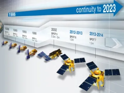 Pléiades 1A和1B分别于2011和2012年发射,提供50cm分辨率的全色图像和2m分辨率的多光谱图像,幅宽20km。卫星由CNES主导研发,Airbus和TAS共同制造,其中TAS负责高分辨率光学载荷HiRI。其每天可采集约1300幅图像,具备日内重访能力。4.2.2 SPOT 6/7