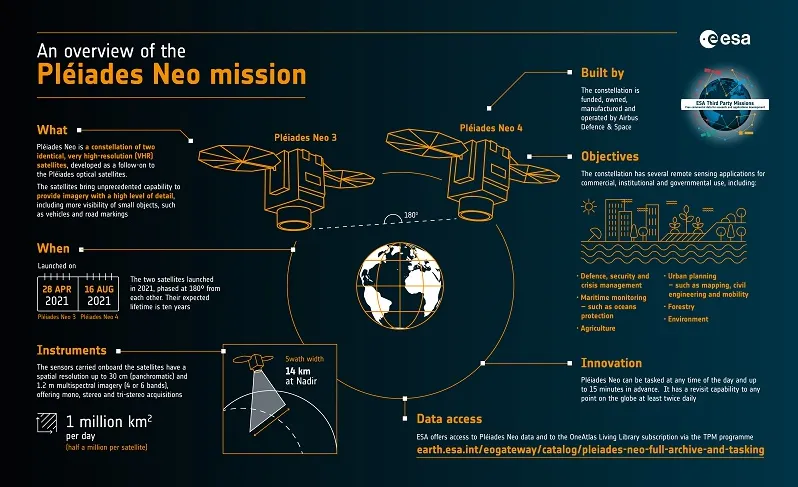 SPOT 6和SPOT 7分别于2012和2014年发射,提供1.5m全色/6m多光谱分辨率,幅宽60km。SPOT系列与Pléiades组成互补星座:Pléiades提供高分辨率图像,SPOT提供宽幅覆盖。4.2.3 Pléiades Neo(第二代)