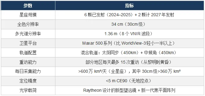Maxar运营着全球最强大的商业光学卫星队伍。WorldView-1(2007年)提供50cm全色图像;WorldView-2(2009年)增加了8波段多光谱能力;WorldView-3(2014年)是首颗商业化的“超光谱”卫星,提供31cm全色+29个光谱波段。GeoEye-1(2008年)提供46cm全色图像。5.2.2 WorldView Legion(新一代)