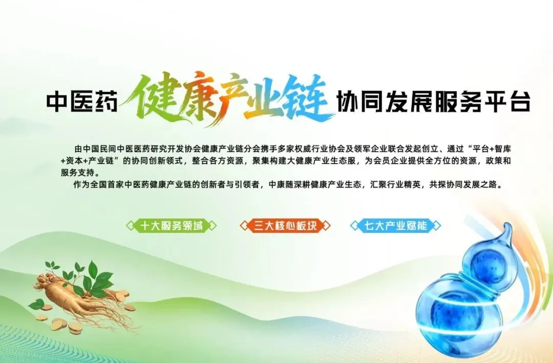 中康链是中医药健康产业链协同发展服务平台,由中国民间中医医药研究开发协会健康产业链分会携手多家权威行业协会及领军企业联合发起创立,通过“平台+智库+资本+产业链”的协同创新模式,整合各方资源,以“政产学研金服贸”七位一体为路径,打造“好种子、好产品、好服务”全链赋能模式,贯通中药材种植到健康服务终端。聚焦产业痛点,整合资源、资本与技术,推动中医药标准化、数字化、国际化,助力健康中国与“一带一路”传统医药合作。