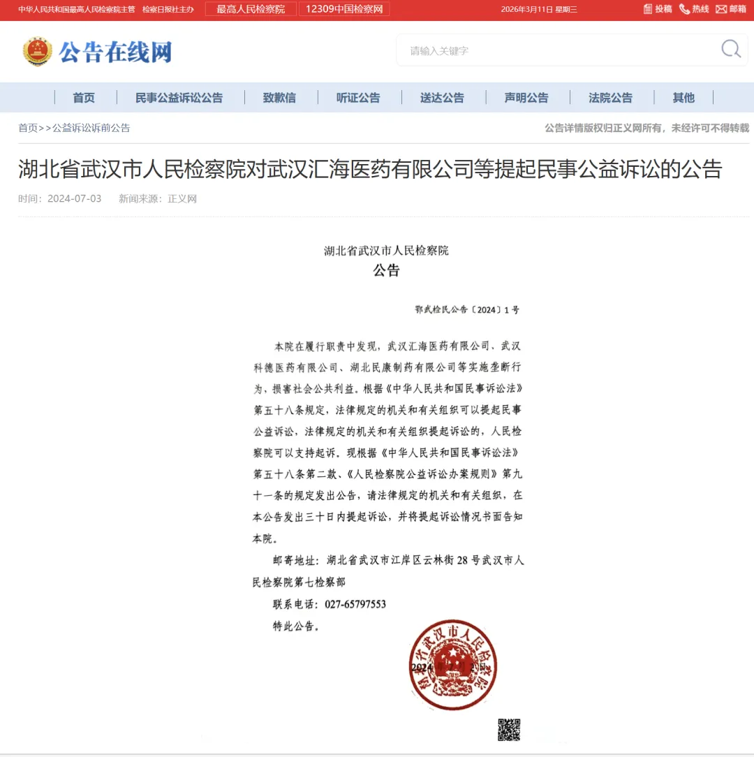 本院在履行职责中发现,武汉汇海医药有限公司、武汉科德医药有限公司、湖北民康制药有限公司等实施垄断行为,损害了社会公共利益。根据《中华人民共和国民事诉讼法》第五十八条规定,法律规定的机关和有关组织可以提起民事公益诉讼,法律规定的机关和有关组织提起诉讼的,人民检察院可以支持起诉。现根据《中华人民共和国民事诉讼法》第五十八条第二款、《人民检察院公益诉讼办案规则》第九十一条的规定发出公告,请法律规定的机关和有关组织,在本公告发出三十日内提起诉讼,并将提起诉讼情况书面告知本院。