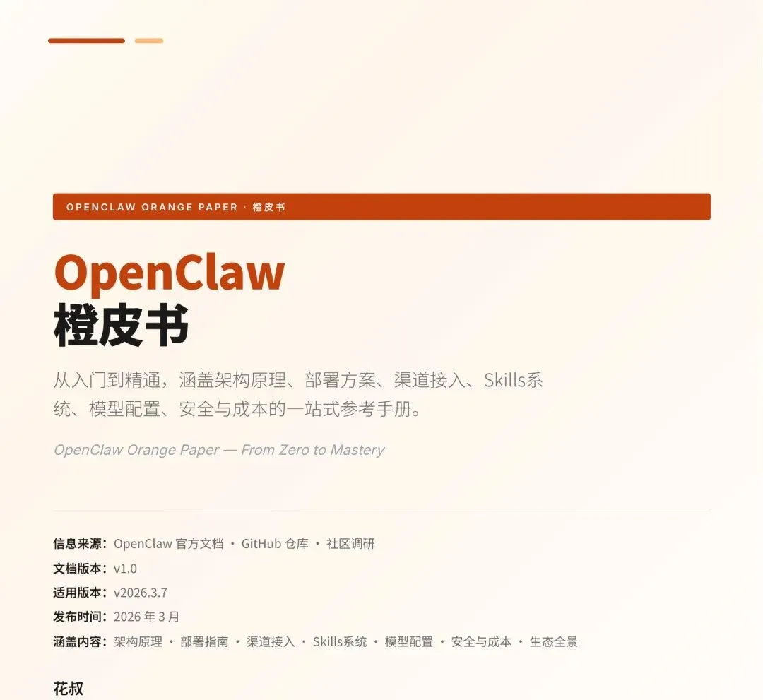 《OpenClaw 橙皮书 —— 从入门到精通》是 2026 年 3 月发布的 OpenClaw 一站式参考手册,适配 v2026.3.7 版本,涵盖其全生命周期相关知识,核心是讲解这款开源自托管 AI Agent 系统如何从聊天工具升级为可自主执行任务的 “数字员工”,以下是核心内容总结: