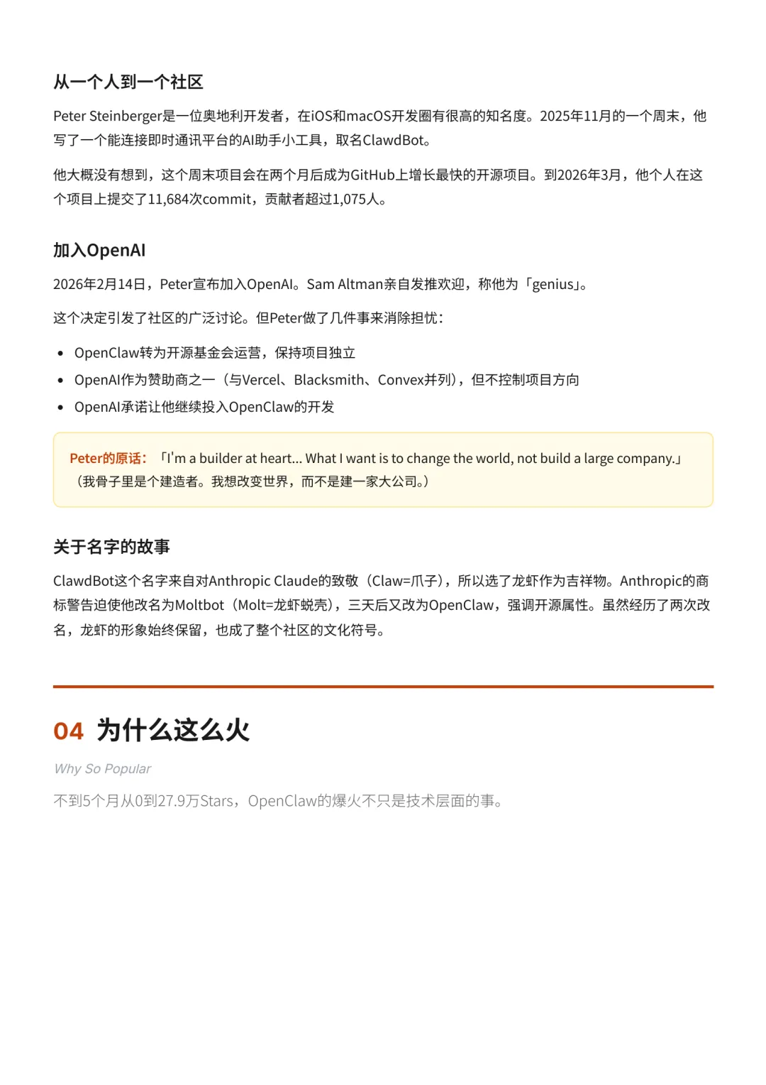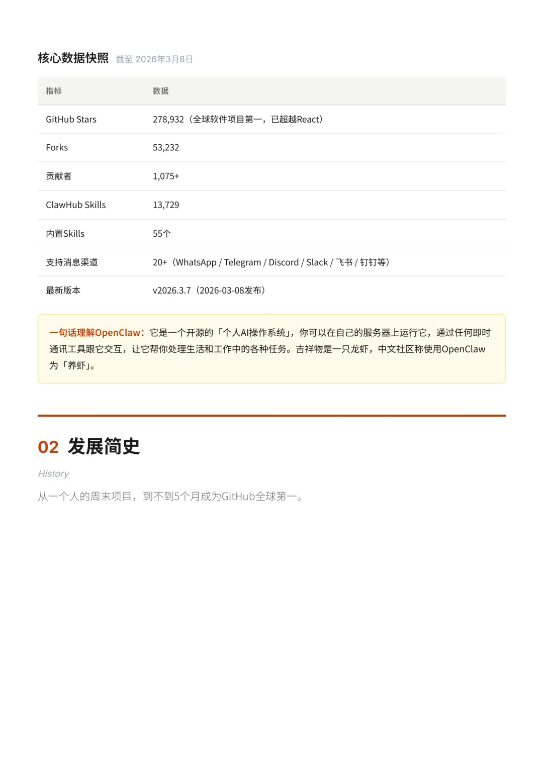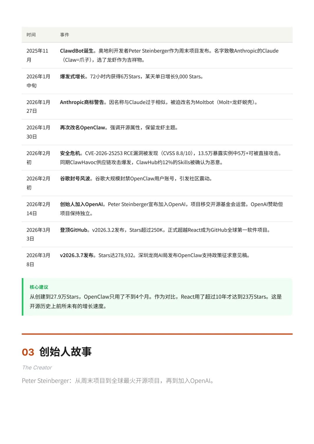 发展速览:2025 年 11 月由奥地利开发者 Peter Steinberger 作为周末项目发布(初名 ClawdBot),因商标问题两度改名后定为 OpenClaw;2026 年 1 月爆发式增长,2 月经历安全危机、谷歌封号风波,创始人加入 OpenAI 并将项目移交开源基金会运营;2026 年 3 月登顶 GitHub(Stars 超 27.8 万,超越 React),国内深圳龙岗 AI 局也发布相关支持政策征求意见稿,不到 5 个月成为全球顶流开源项目。