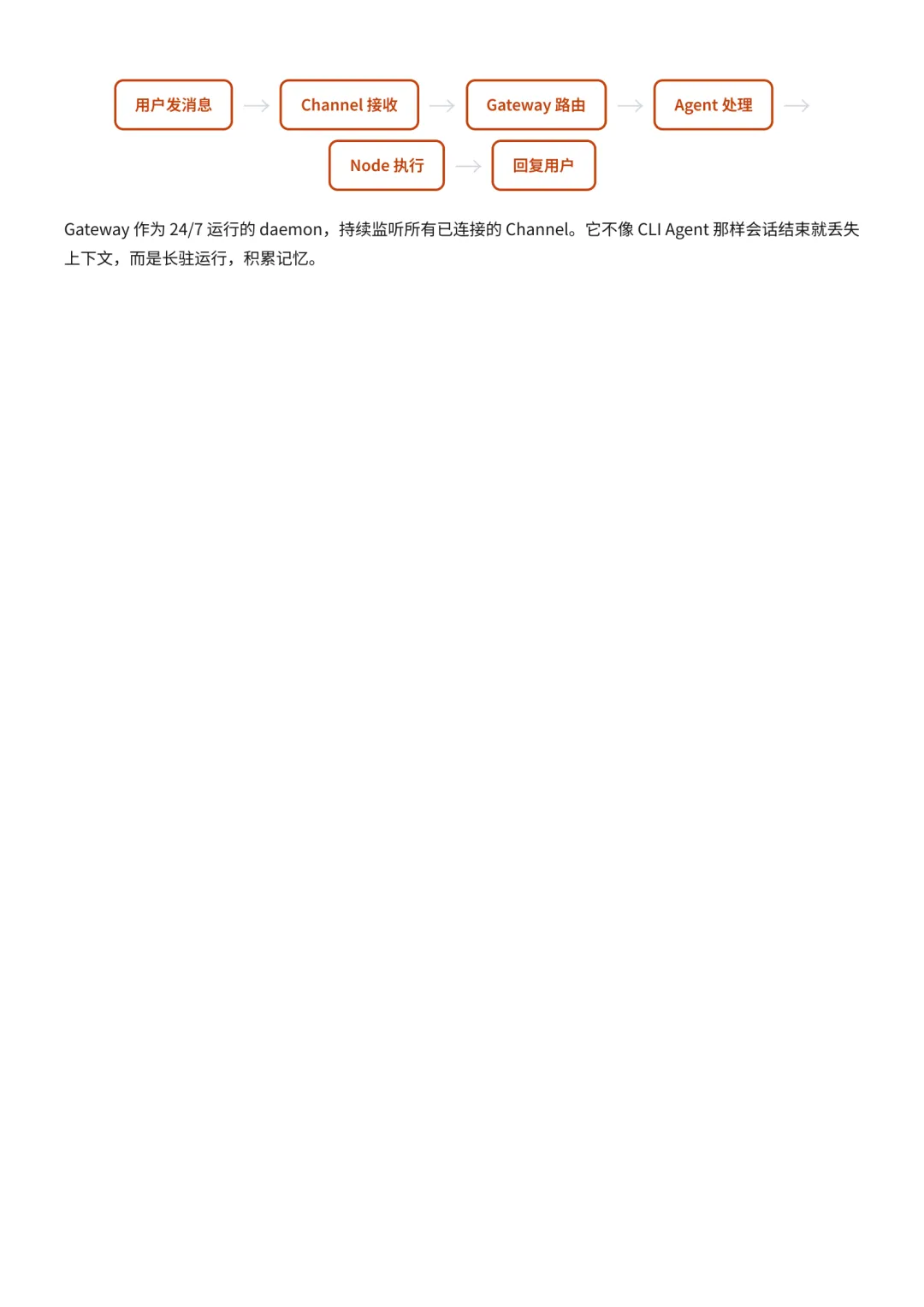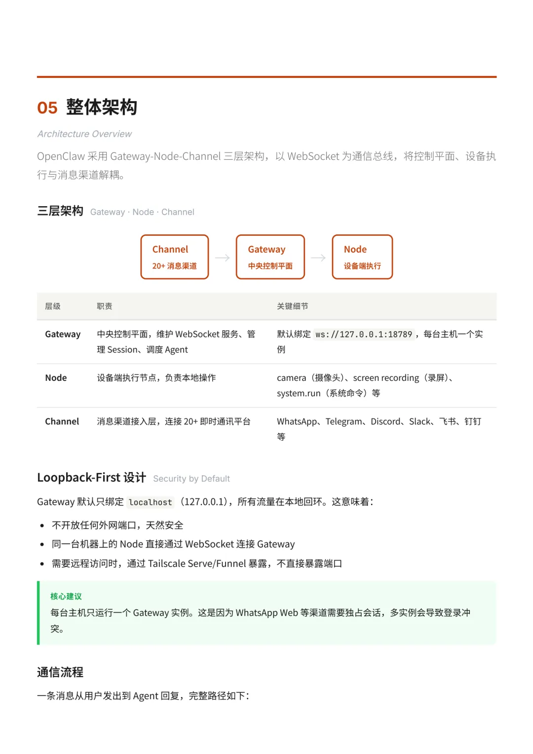 三层架构:采用 Gateway-Node-Channel 架构,以 WebSocket 为通信总线,Gateway 为中央控制平面、Node 为设备执行节点、Channel 为消息渠道接入层,默认本地回环设计保障天然安全。