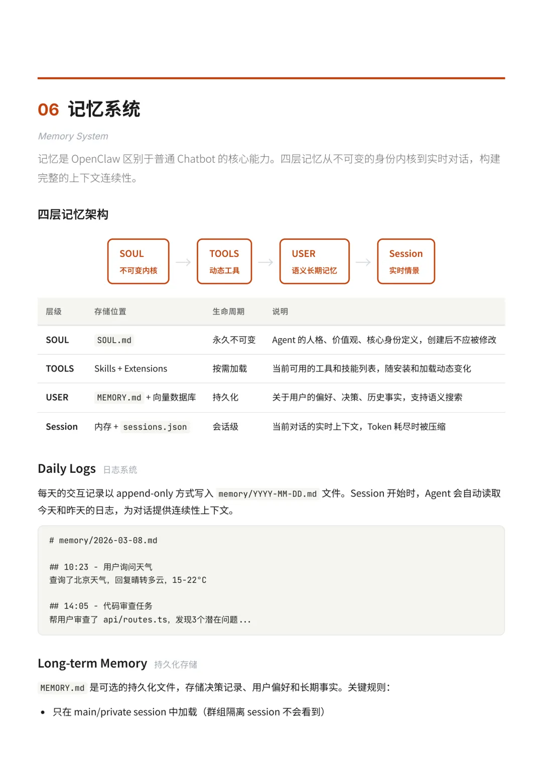 四层记忆系统:SOUL(永久人格内核)、TOOLS(按需加载技能)、USER(用户持久化偏好)、Session(会话级实时上下文),搭配日志系统、向量记忆搜索,实现真正的持久化记忆,解决普通 Chatbot 上下文丢失问题。