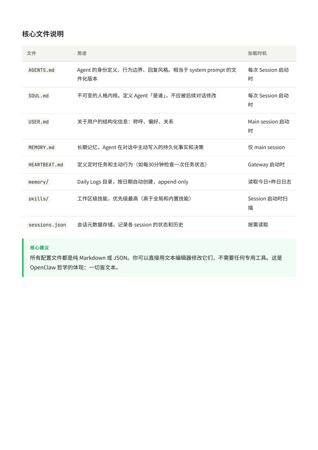 Agent 工作区:所有配置、记忆、技能以纯文本文件存储,遵循 “一切皆文本” 理念,支持用户直接用编辑器修改,工作区有明确的目录结构和核心文件分工。