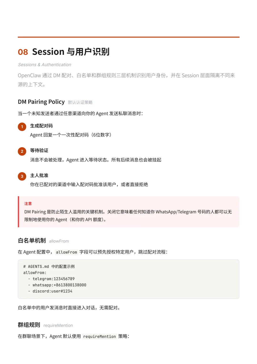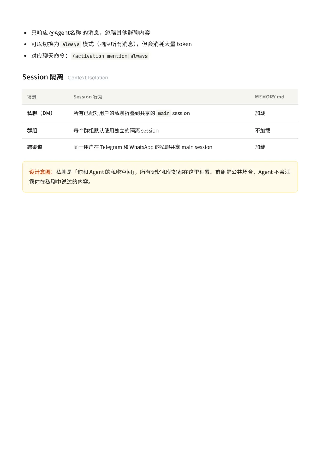 会话与用户识别:通过 DM 配对、白名单、群组规则实现身份识别和上下文隔离,私聊共享主会话且加载长期记忆,群组独立会话不加载记忆,防止隐私泄露。