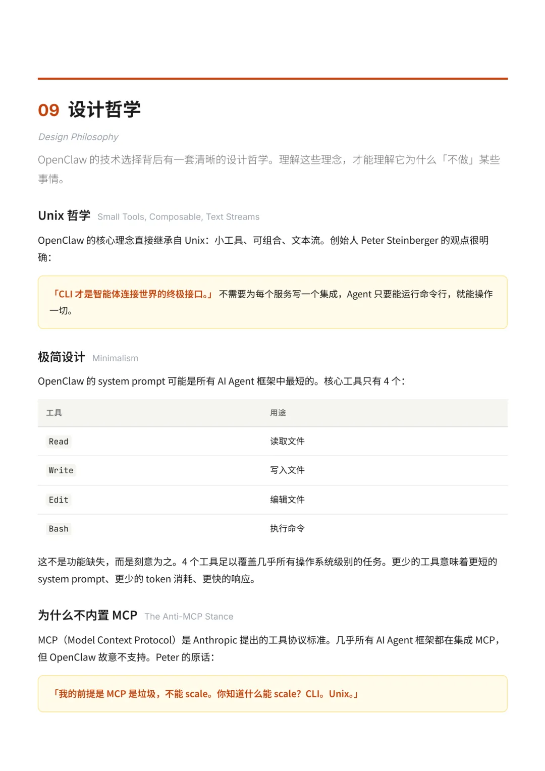 设计哲学:继承 Unix 小工具、可组合、文本流理念,极简设计仅保留 4 个核心工具,拒绝 MCP 协议转而用 CLI 实现可扩展性,Agent 支持运行时自我扩展能力,会话采用树形结构支持分支探索,代码规模约 43 万行 TypeScript,运行内存约 1GB,启动快且可 24/7 运行。
