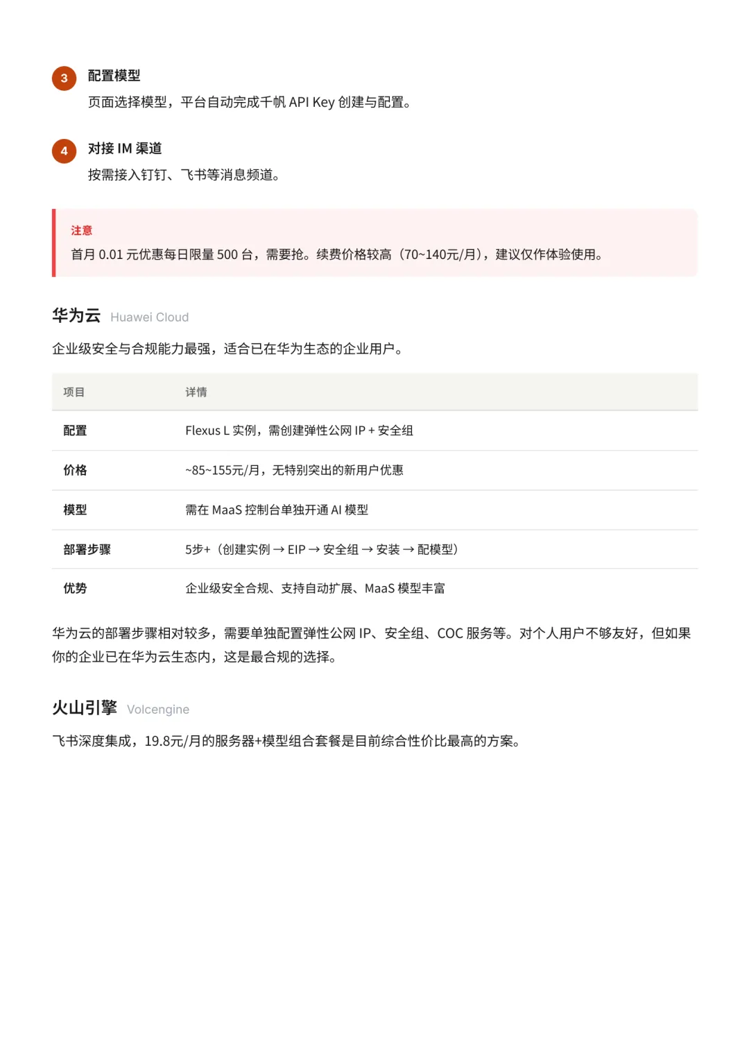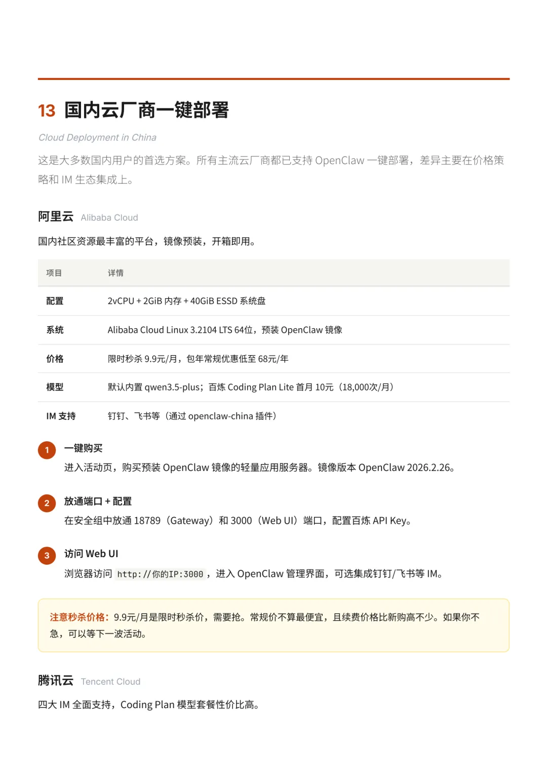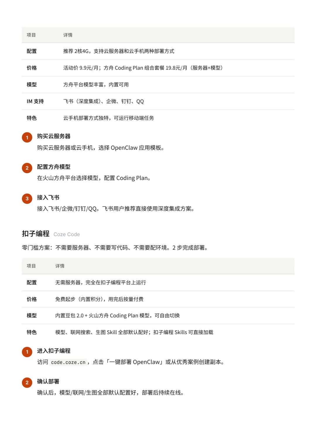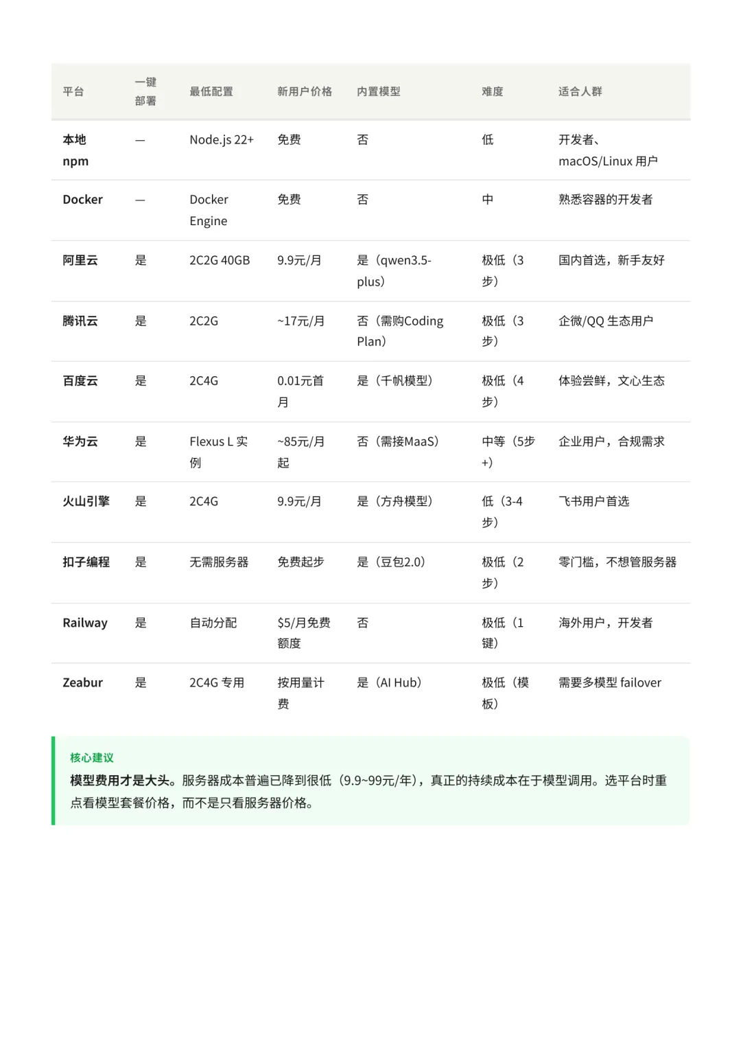 多部署方式:支持本地 npm 安装、Docker 部署、国内云厂商一键部署(阿里云、腾讯云、百度云等)、海外平台部署(Railway、Zeabur 等),还有零门槛的扣子编程部署方案,不同方案适配不同技术水平和使用场景,国内云厂商方案新手友好,服务器成本极低(低至 9.9 元 / 月)。