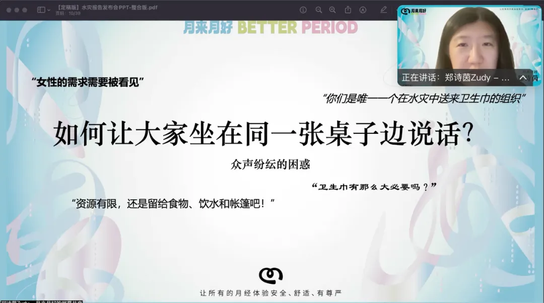 月来月好的发起人郑诗茵Zudy首先介绍了《她在洪水中》研究的动力:月来月好在开展灾后的卫生巾捐赠时,收到了各种各样的反馈:有支持与感谢,也有困惑与疑问。我们意识到,尽管国际上有较多数据,但仍然很少看见基于中国本土的气候X救灾X性别的交叉实证研究。同时,由于不同行业工作者的多元背景、关切与工作方式,面对看似一致的话题,各方常常是“各说各话”。