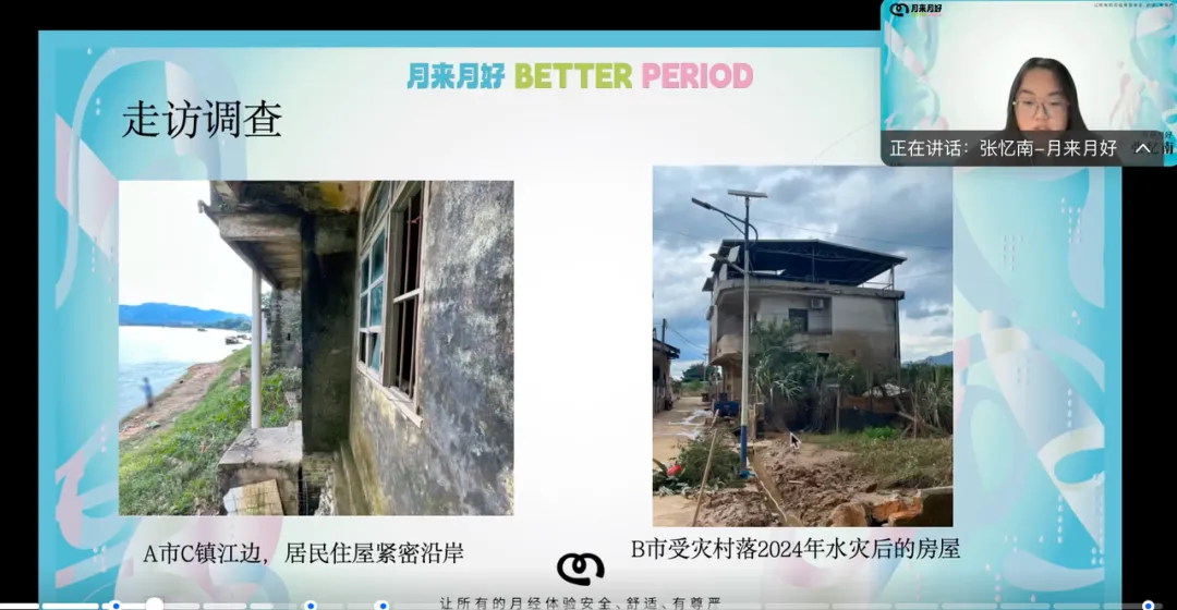 月来月好研究中心负责人张忆南介绍了报告的主要发现:《她在洪水中》报告关注灾害中的具体情境如何影响女性个体的感受与决策,试图通过记录受灾女性的身体体验,倡导中国社会各界关注应急情况下的女性的需求,并在政策治理中纳入社会性别视角。通过线上访谈与参与式观察的研究方法,本研究试图回答如下研究问题: