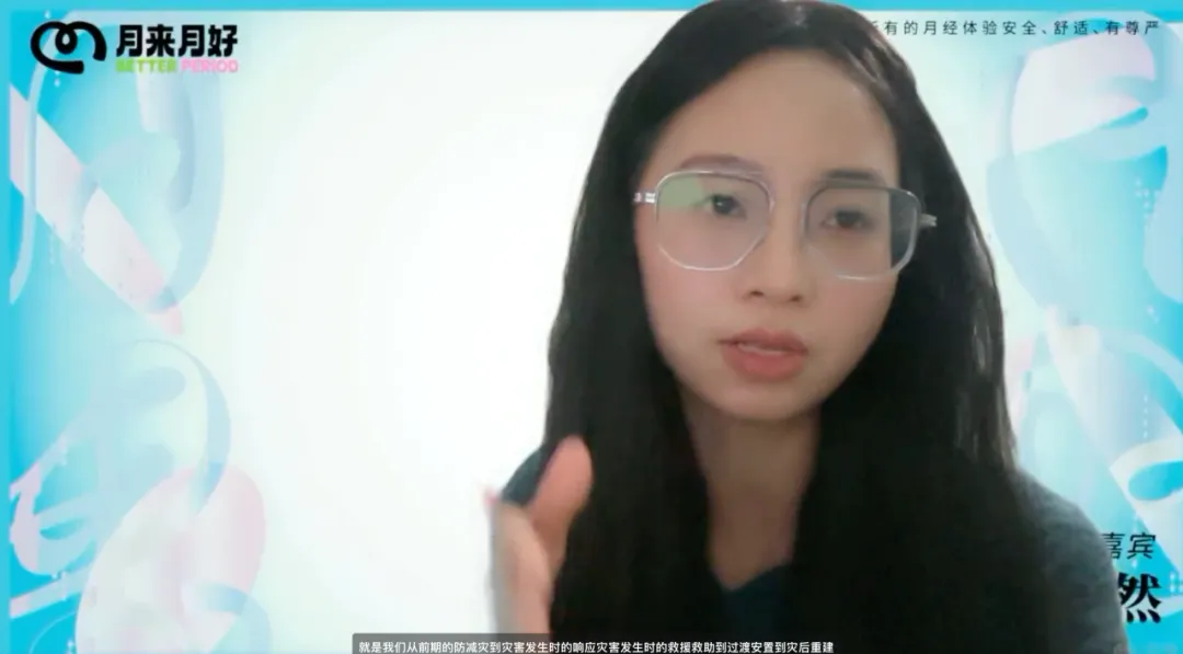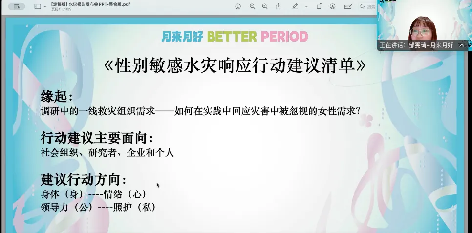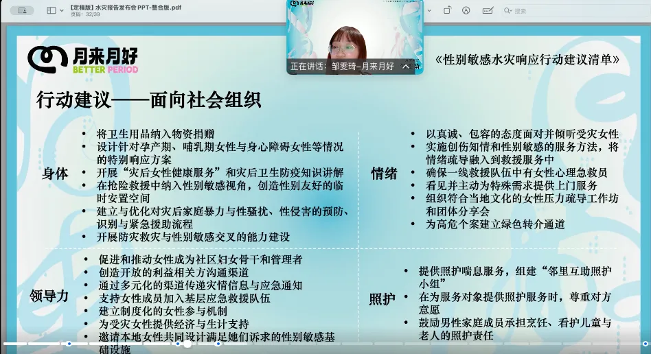 《性别敏感水灾响应行动建议清单》(下简称《建议清单》)的主笔人、月来月好的核心志愿者邹雯琦首先分享了《建议清单》的缘起:月来月好在开展《她在洪水中》调研中,收到的一线救灾组织需求:“我们深切感受到,灾害中的女性需求常因‘不好意思说’‘没人重视’而被忽视。”她们向我们提出期待:能否准备一份行动建议清单,让这些隐性需求有被看见、被回应的依据?基于此,我们在原创研究与案头调研的基础上,初步提出此《行动建议清单》。