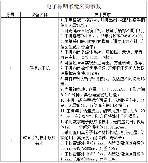 为满足我院耳鼻喉科临床诊疗需求,提升上呼吸道疾病诊断与微创治疗能力,现拟对电子鼻咽喉镜采购项目开展市场调研,欢迎符合资质要求的供应商积极参与。