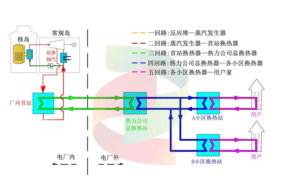 首先,一回路核反应产生的热量,通过蒸汽发生器,将二回路的水加热成高温高压蒸汽;二回路部分蒸汽被抽取用来加热核电厂内换热站的水,加热后的水通过三回路传送到热力公司总换热站;在总换热站,三回路继续加热四回路内的水;接着四回路的水就沿市政供热网络传输到小区的换热站中,将热量传递给五回路,进而送入千家万户家中,从而实现为居民供暖的目的。五个回路之间只有热量的传递,没有水的交换。就像自热小火锅一样,热源和食物没有接触,食物可放心食用。核能供热用户接触到的是与传统供热方式一样的热水。并且通过三回路与二回路间的压差设计、在线监测等,实现多重屏障防御。