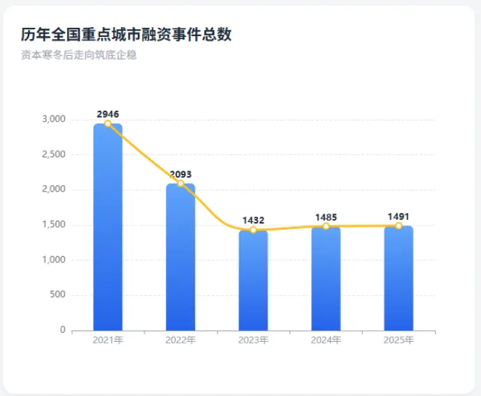 然而,市场出清的过程虽然残酷,却是必要的。到了2024年(1485起)和2025年(1491起),融资事件数连续两年保持微幅增长,数据面的企稳释放出强烈的积极信号。这表明: