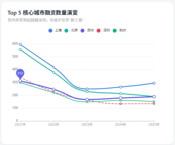 无锡与宁波:这两座长三角的“双子星”同样表现优异,2023到2025年间融资事件分别增长了约24%和42%。它们凭借强大的制造业基础和邻近上海的区位优势,在高端医疗器械、CXO服务等领域承接了大量外溢资源和产业落地需求。