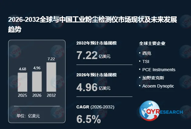 根据QYR(恒州博智)的统计及预测,2025年全球工业粉尘检测仪市场销售额达到了4.68亿美元,预计2032年将达到7.22亿美元,年复合增长率(CAGR)为6.5%(2026-2032)。