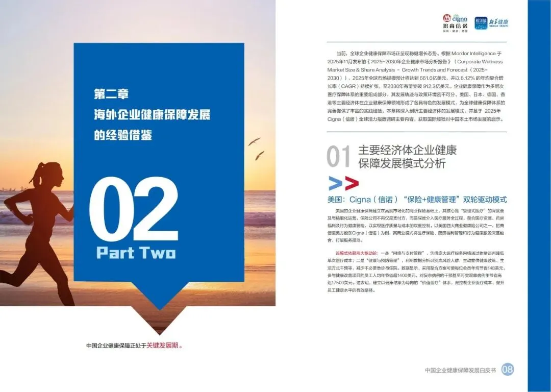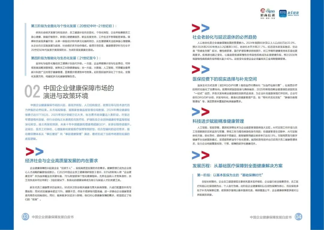 在“健康中国”战略深化推进、人口老龄化加剧、职场健康需求升级的多重背景下,招商信诺人寿联合新华社旗下新华健康平台发布《2025中国企业健康保障发展白皮书》,系统梳理了中国企业健康保障的发展现状、海外经验、市场痛点与未来趋势,为企业搭建高质量健康保障体系提供了全方位的行动指南。这份白皮书明确指出,健康早已不再是单纯的员工个人问题,而是成为企业提升核心竞争力、实现高质量发展的确定性资产,企业健康保障也完成了从“基础福利”到“战略投资”的本质转变。今天,我们就为大家深度拆解这份白皮书的核心内容,看清企业健康保障的发展逻辑与未来方向。