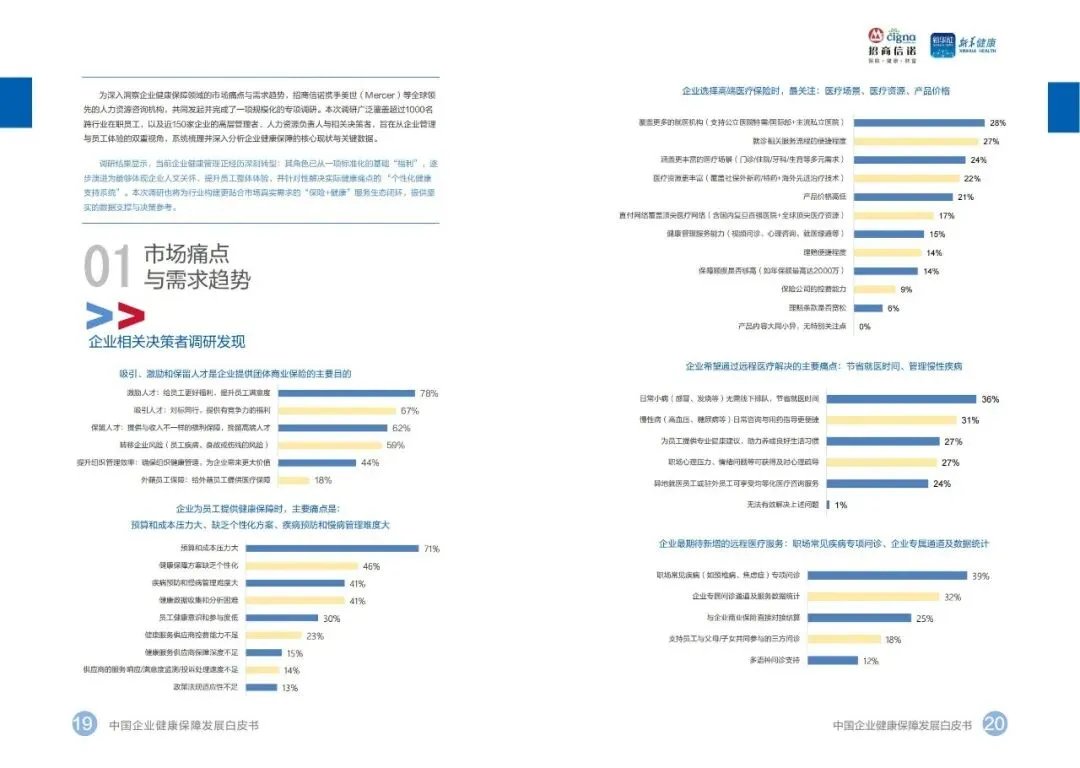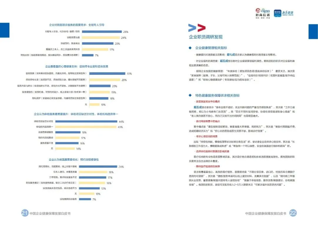 2.员工端:超七成员工认为健康福利影响雇主选择,超五成对现有福利满意,但仍期待提升年度体检标准、扩大家属保障范围、优化在线问诊与心理健康服务;就医时面临事后报销流程繁琐、需垫付高额费用、预约周期长等问题,对不限社保目录、线上理赔、专人就医协助的需求强烈。