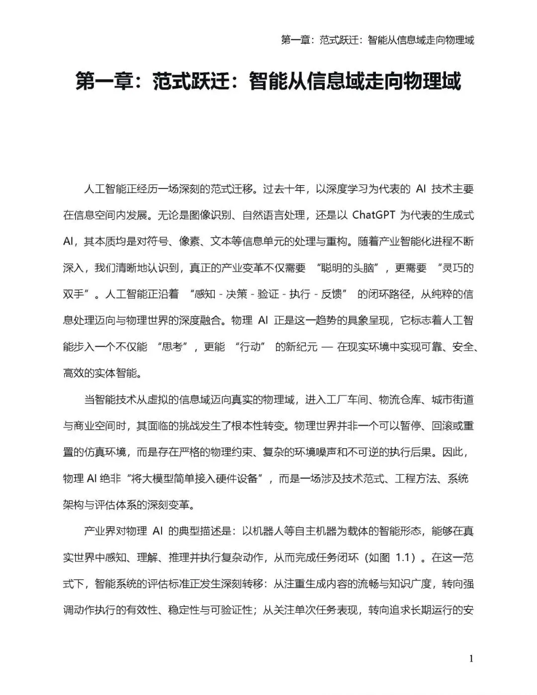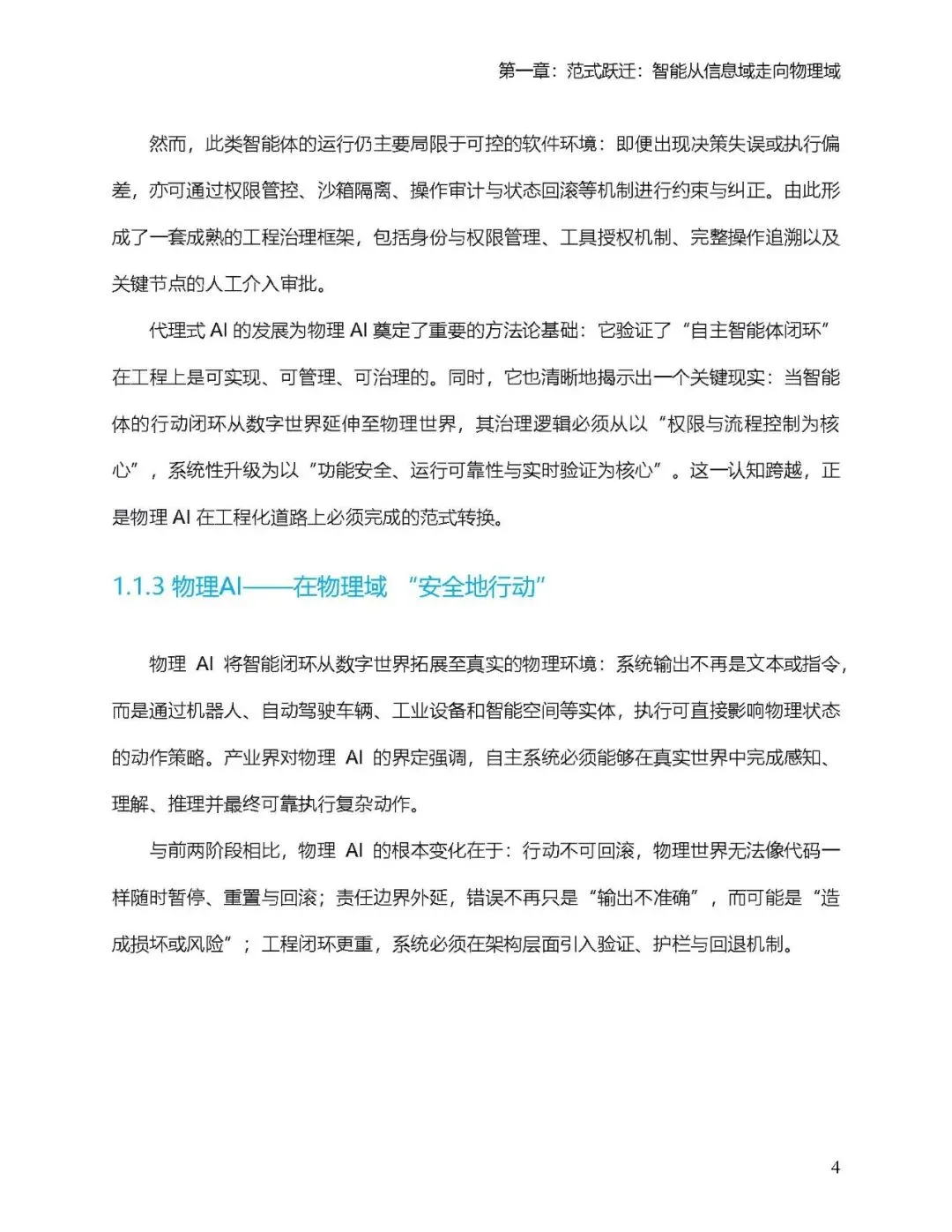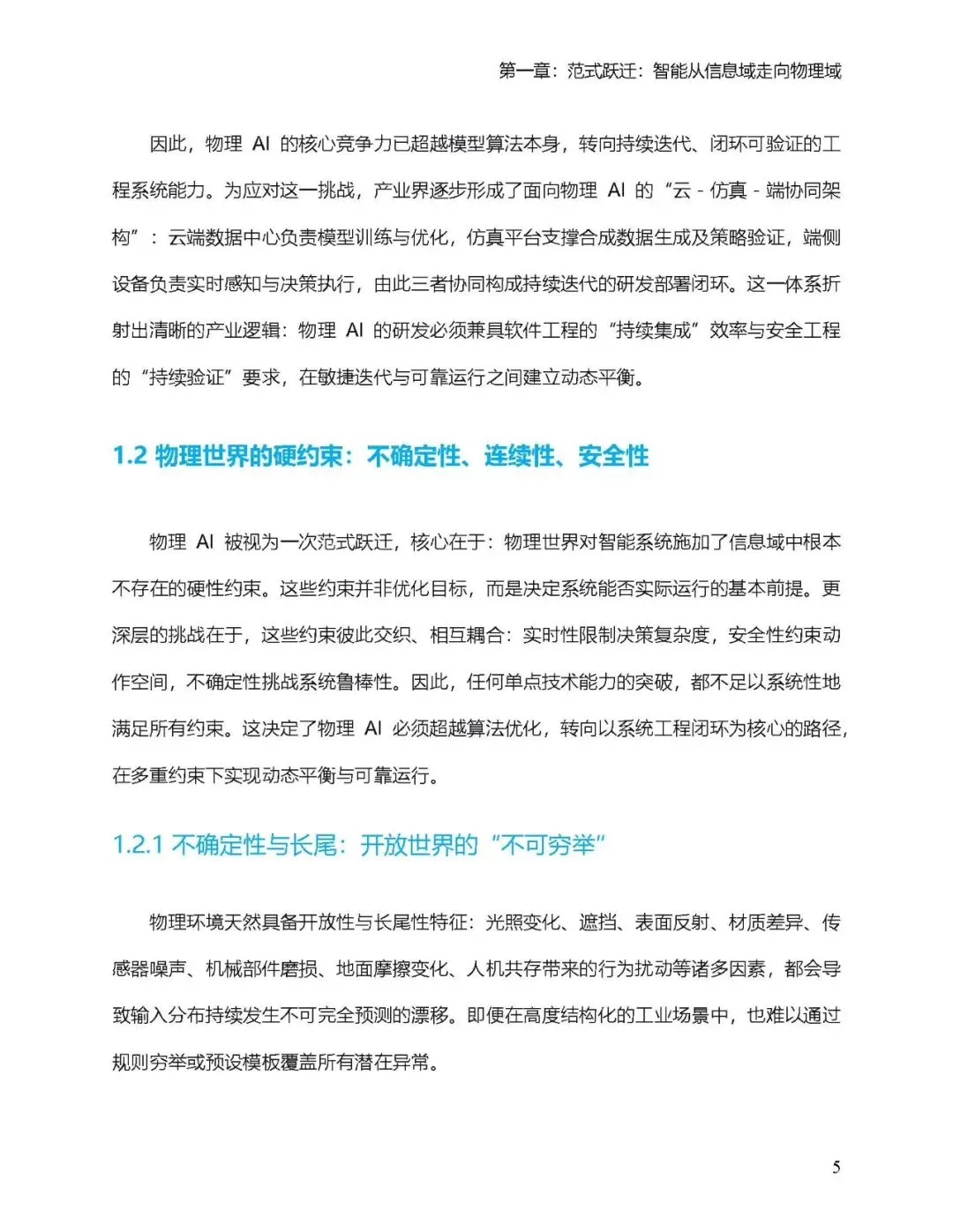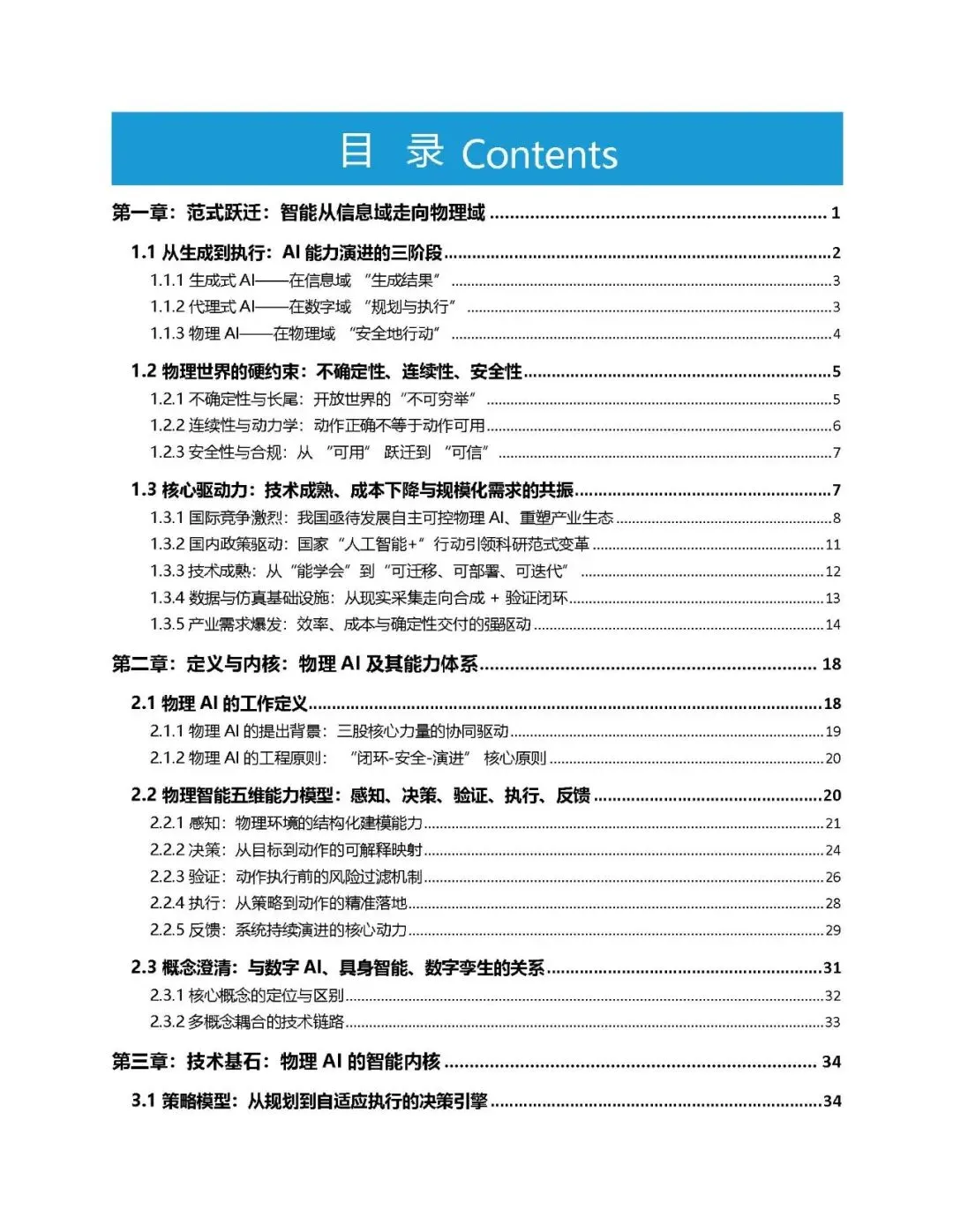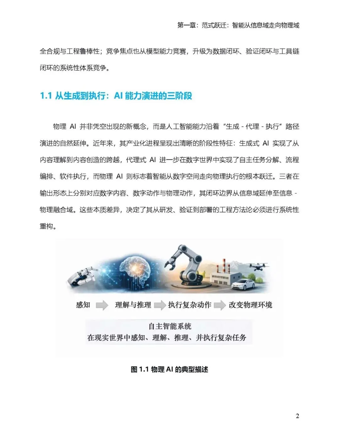 物理AI通过在真实物理环境中构建 “感知-决策-验证-执行-反馈” 闭环,实现了从虚拟智能向实体执行的跃迁。其核心价值在于,让智能不仅能够 “思考”,更能够 “行动”,可靠、安全、高效地在物理世界中执行任务。 本白皮书旨在为这场正在进行中的变革提供清晰的路线图。我们面向产业决策者、技术负责人、生态伙伴及政策制定者,系统阐述物理AI的定义体系、能力模型、工程架构与关键技术,并最终给出可落地的产业实施路径与生态趋势研判。