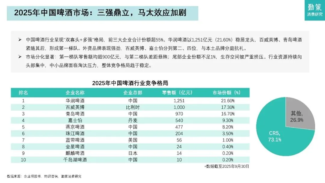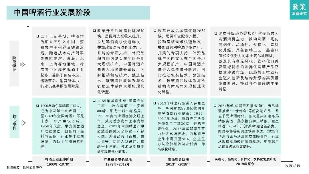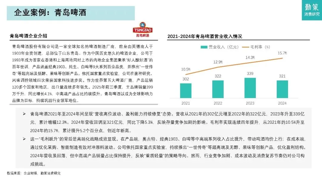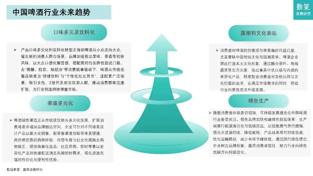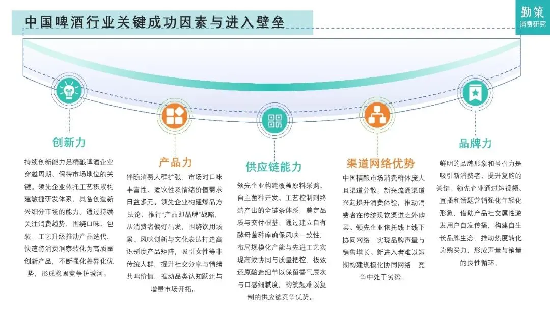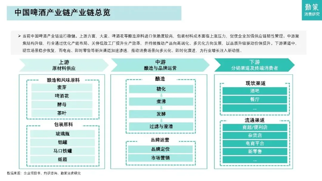 消费升级、Z世代主导消费、流通渠道拓展及包装创新驱动行业发展。同时,食品安全、消费者需求变化、原材料成本波动及环保政策趋严成为挑战。产业链上游成本承压,中游聚焦价值重塑,下游渠道多元化。华润雪花、青岛啤酒等龙头企业通过高端化战略与精细化运营保持领先,精酿啤酒企业则依靠持续创新能力穿越周期。未来,行业将向更高层次升级发展,满足消费者多元化需求。