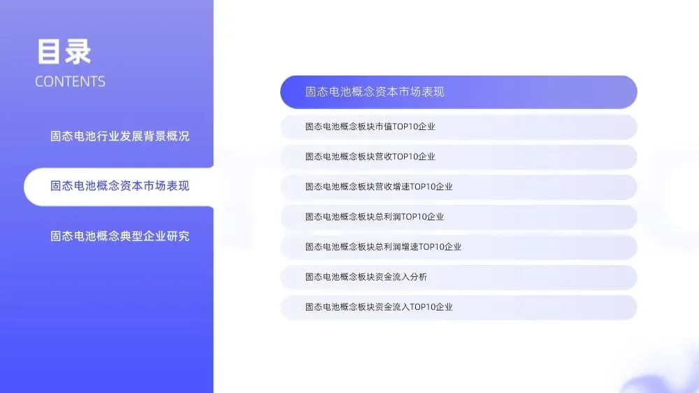 本报告是一份基于数据、全面梳理固态电池行业现状与前景的综合性研究报告。它从技术、市场、产业链、资本及企业案例等多个维度,系统性地描绘了固态电池作为下一代电池技术核心的发展全貌。报告的核心结论是:固态电池产业正处于从技术突破迈向规模化商业应用的关键拐点,半固态电池已进入商业化验证,全固态电池产业化进程明确,市场前景广阔,但竞争格局尚未完全固化,资本市场热度与分歧并存。报告遵循“行业背景—市场表现—企业案例”的经典分析框架:1. 第一部分(行业背景):回答了“是什么”和“为什么重要”的问题。定义了固态电池,分析了其技术优势、发展历程、政策环境、市场规模和产业链结构,奠定了行业的战略价值基础。2. 第二部分(资本市场表现):回答了“市场怎么看”的问题。通过市值、营收、利润、增速、资金流向等多维度数据,量化呈现了固态电池概念在资本市场的热度、结构及投资者情绪。3. 第三部分(典型企业研究):通过比亚迪(行业龙头) 和英联股份(转型新锐) 两个典型案例,具体化了行业的两种发展路径和商业模式,使宏观分析得以落地。 ◦ 定义:固态电池是一种用固态电解质替代传统液态电解液的新型电池技术。根据固态电解质用量,分为半固态和全固态。 ◦ 三大核心优势:报告明确了其对传统锂电池的颠覆性潜力: ▪ 超高能量密度:理论可达400-500Wh/kg以上,支撑电动汽车续航超1000公里,解决里程焦虑。 ▪ 本质安全:固态电解质不可燃,从根本上杜绝热失控风险(如小米麒麟电池碰撞测试示例)。 ▪ 更长循环寿命:如当升科技材料配合固态电解质,循环寿命可超2500次,降低全周期成本。 ◦ 发展历程:报告将发展分为五个阶段,目前正处于 “规模化生产与应用拓展期(2021-2025)” ,并展望 “全面普及与技术迭代期(2025年以后)” 。这表明行业已从实验室走向产业化前期。 ◦ 强政策支持:2025年以来政策密集出台,如《新型储能制造业高质量发展行动方案》、《关于推进能源装备高质量发展的指导意见》等,均将固态电池列为重点攻关方向,为行业发展提供了明确的政策“风向标”和资源支持。 ◦ 设备先行:报告预测,到2030年全球固态电池设备市场规模将飙升至1079.4亿元,年复合增长率超70%。其中,全固态电池设备增速预计超150%。这揭示了产业链中设备环节将最先受益的投资逻辑。 ◦ 出货量预测:全球固态电池(半固态+全固态)出货量将从2026年的34GWh爆发式增长至2030年的614GWh。半固态电池将率先装车,全固态预计2027年左右启动小批量生产,2030年占比提升至30%。这描绘了清晰的技术演进和商业化路径。 ◦ 产业链图谱:报告清晰勾勒了上中下游分工。上游(原材料/设备)、中游(材料/电芯制造)、下游(新能源汽车/储能/机器人等)构成了完整的产业生态,其中中游的电池集成制造是技术转化与量产落地的关键环节。报告通过详实的数据,揭示了固态电池概念板块在资本市场的复杂图景。 ◦ 市值与营收:宁德时代、比亚迪、上汽集团在市值和营收榜上稳居前三,且CR3(前三名集中度)在市值和营收中占比分别高达73.1%和超过50%。这表明行业资源和市场信心高度集中于少数已建立起规模和技术壁垒的巨头。 ◦ 营收增速榜:华亚智能、德新科技、莱尔科技等营收增速超70%,但它们普遍规模较小。这反映了在巨头主导的格局下,一批在专用设备、精密制造、新材料等细分领域具备技术优势的中小型企业,正凭借行业高景气度实现快速成长。 ◦ 利润增速榜:光华科技、楚江新材、英联股份等利润同比增速惊人(最高达5023.49%)。尽管部分源于低基数效应,但也强烈印证了切入固态电池相关材料(如锂电池材料、复合集流体)等赛道带来的巨大业绩弹性。 ◦ 报告指出一个关键现象:超大单和大单资金(代表机构主力)呈现净流出,而中单和小单资金(代表散户)呈现净流入。这表明: ▪ 机构态度谨慎:可能认为当前板块估值已偏高,或对全固态电池商业化进程的不确定性持观望态度。 ▪ 散户情绪乐观:被行业长期前景和技术故事吸引,积极入场。 ◦ 个股资金关注点:在特定交易日,资金流入集中在星源材质(隔膜)、赣锋锂业(锂资源)、中天科技(材料) 等上游材料及零部件企业,说明市场在关注电池集成商的同时,同样看好核心技术突破和产能瓶颈环节。报告选取的两个案例极具代表性,展现了行业参与者的两种典型画像: ▪ 规模庞大:营收超5600亿元,利润超280亿元,基本盘稳固。 ▪ 研发激进:2025年前三季度研发费用437.48亿元,同比增长31.3%,持续加码天神之眼、超级闪充等前沿技术,为固态电池等下一代技术储备能力。 ▪ 资金面波动:报告显示其主力资金波动大,且散户资金(中单、小单)持续净流出,反映了市场对其短期盈利承压(净利润同比下降)与长期转型投入之间的权衡与分歧。 ◦ 定位:从金属包装成功切入新能源材料领域的“第二曲线”探索者。 ▪ 转型坚决:2022年底切入新能源,主攻复合集流体(复合铝箔/铜箔),这是提升固态电池能量密度和安全性的关键材料之一。 ▪ 进展显著:已获得准固态/半固态电池客户的批量订单,并与头部客户深化合作。这表明其技术已得到下游产业验证。 ▪ 业绩爆发:2025年前三季度归母净利润同比暴涨1572.67%,研发投入同步增长24%。公司规划总投资近31亿元扩产,展现了All in新能源的决心和资本市场对其