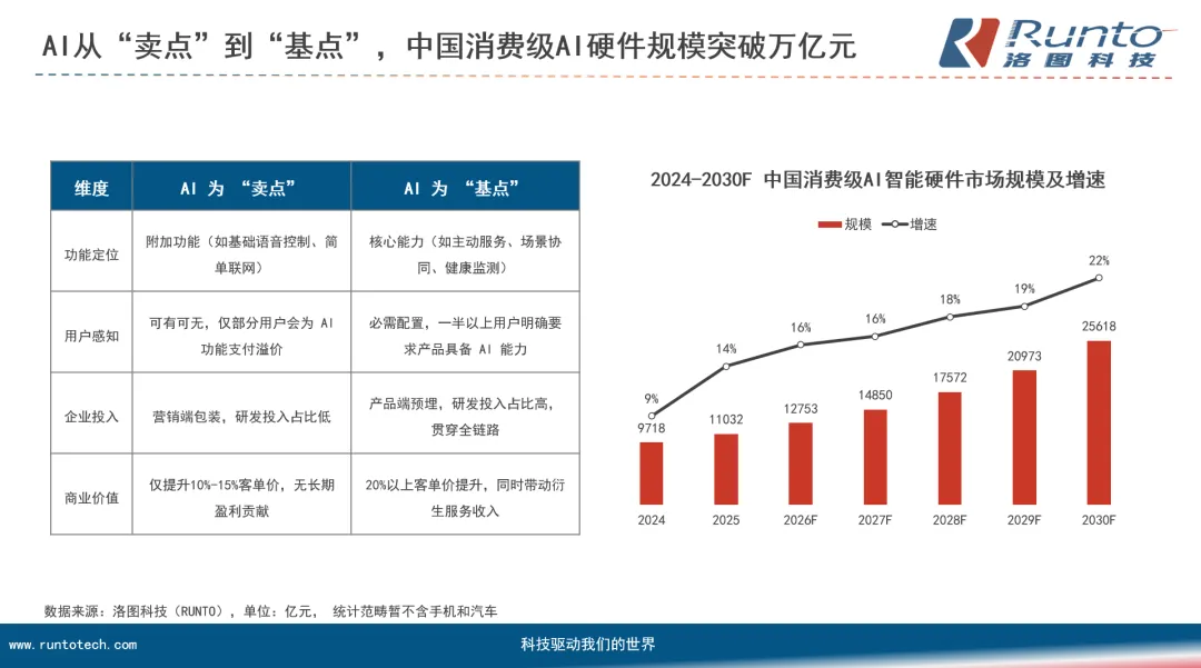 长期以来,大量的消费电子产品深陷产品参数与价格的红海内卷。而现如今,AI将可能驱动行业驶入价值创造的广阔蓝海。洛图科技(RUNTO)调研表明,越来越多的用户愿意为“更懂我”的体验支付溢价,带AI功能的产品普遍享有更高的价值认可。