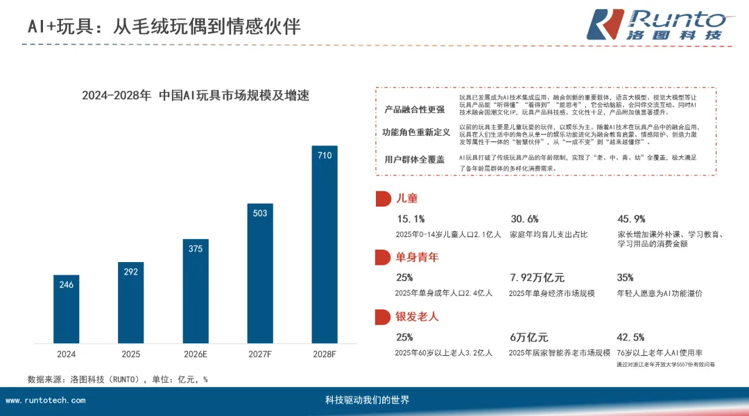 根据洛图科技(RUNTO)数据显示,2025年,中国AI玩具市场的规模为292亿元,同比增长了17.8%。未来三年,该行业仍将处于快速发展阶段,预计到2028年,中国AI玩具市场的规模将突破700亿元。