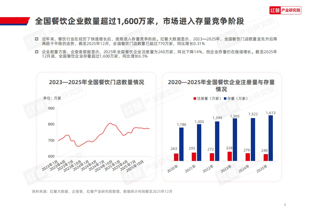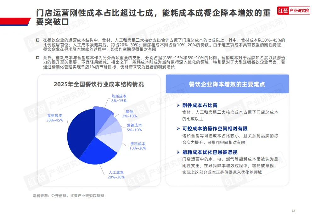 2026年餐饮降本增效创新策略研究报告指出,餐饮行业已进入存量竞争阶段,降本增效成为企业生存发展的核心课题,而以AI技术赋能能耗优化成为行业重要创新方向。截至2025年12月,全国餐饮门店超770万家、企业存量破1600万家,但行业面临人均消费下滑、核心成本攀升的双重压力,门店平均存续周期缩短至15个月,传统粗放式降本手段已难以为继,精细化、智能化运营成为行业趋势。