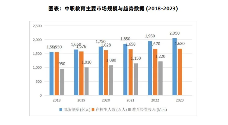 近年来,我国中职教育市场规模持续扩大,入学人数稳步增长。2023 年,全国中等职业学校在校生超过 1200 万人,占中等教育阶段学生总数的近 30%。随着经济发展对技能人才需求的提升,市场潜力巨大。