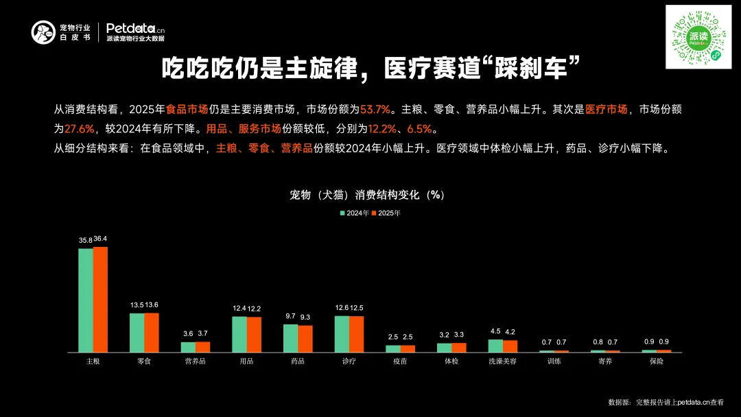从消费结构看,2025年食品市场仍是主要消费市场,市场份额为53.7%。主粮、零食、营养品小幅上升。其次是医疗市场,市场份额为27.6%,较2024年有所下降。用品、服务市场份额较低,分别为12.2%、6.5%。