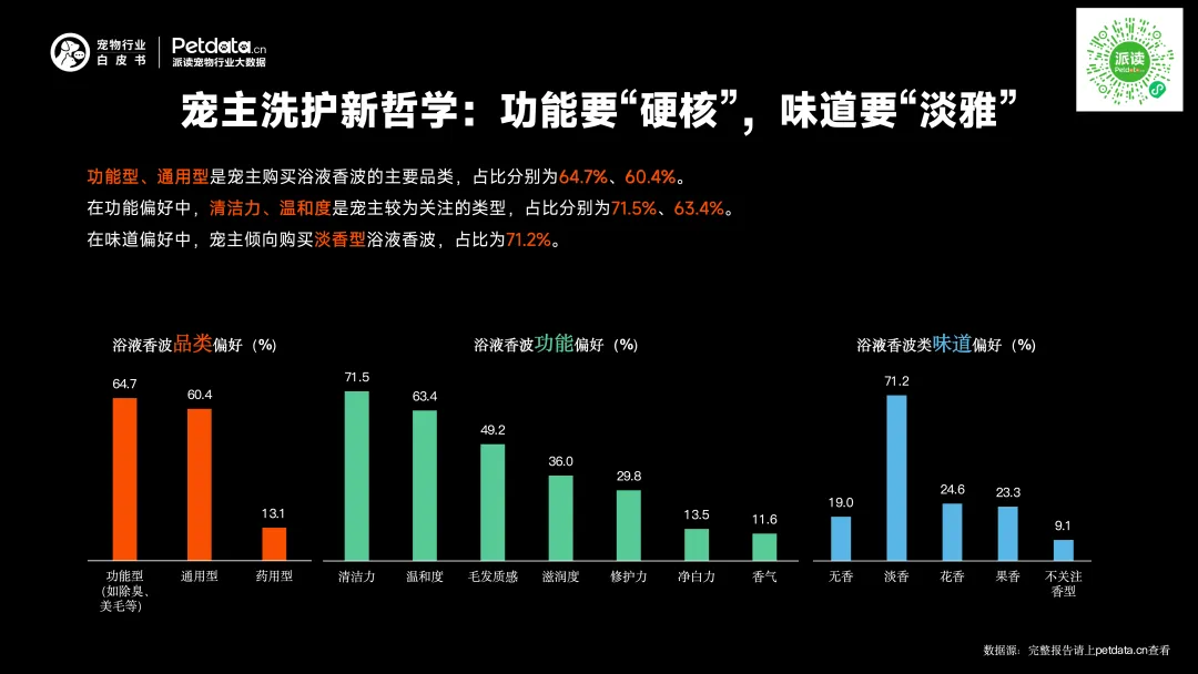 2、宠主洗护新哲学:功能要“硬核”,味道要“淡雅”。
