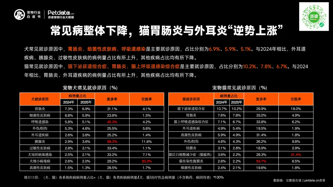 犬常见就诊原因中,胃肠炎、细菌性皮肤病、呼吸道感染是主要就诊原因,占比分别为6.9%、5.9%、5.1%。与2024年相比,外耳道疾病、胰腺炎、过敏性皮肤病的病例量占比有所上升,其他疾病占比均有所下降。猫常见就诊原因中,猫下泌尿道综合症、胃肠炎、猫上呼吸道感染综合症是主要就诊原因,占比分别为10.2%、7.8%、6.7%。与2024年相比,胃肠炎、外耳道疾病的病例量占比有所上升,其他疾病占比均有所下降。