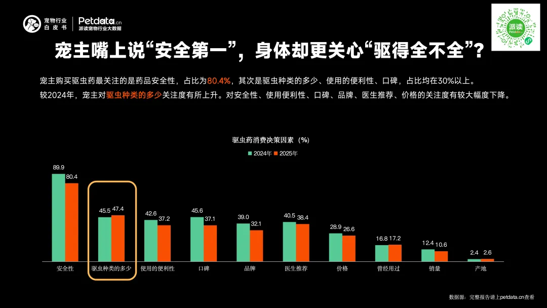 宠主购买驱虫药最关注的是药品安全性,占比为80.4%,其次是驱虫种类的多少、使用的便利性、口碑,占比均在30%以上。较2024年,宠主对驱虫种类的多少关注度有所上升。对安全性、使用便利性、口碑、品牌、医生推荐、价格的关注度有较大幅度下降。