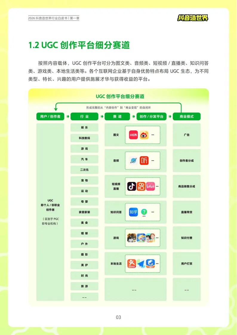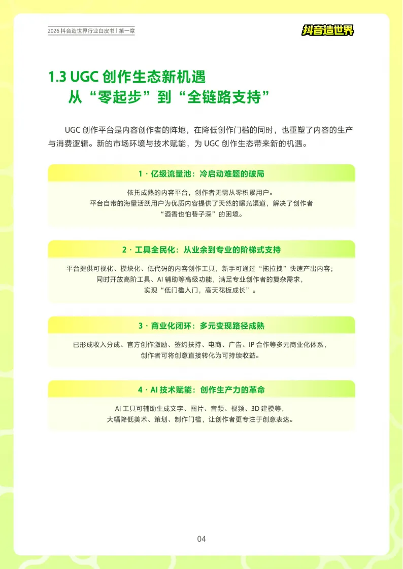 《2026年抖音造世界行业白皮书》围绕抖音打造的UGC创作生态展开,展现了当下UGC创作平台的成熟发展与抖音造世界的生态布局及未来趋势。