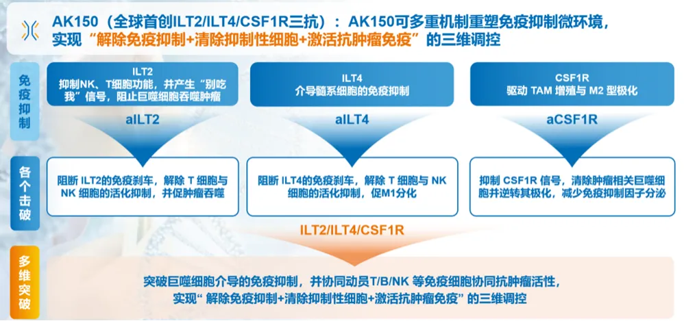 過往十餘年,以PD-1/PD-L1、CTLA-4為代表的免疫檢查點抑制劑主要聚焦於啟動T細胞,雖取得了革命性成就,但客觀緩解率普遍面臨瓶頸,尤其在所謂的“冷腫瘤”中療效不佳。業界逐漸認識到,腫瘤微環境中充斥著由髓系來源的抑制性細胞(如腫瘤相關巨噬細胞 TAMs、髓源性抑制細胞 MDSCs)構成的物理與化學屏障,它們是導致免疫治療原發性耐藥的關鍵。AK150的設計邏輯正是為瞭解決這一核心痛點。它同時靶向CSF1R、ILT2、ILT4三個在髓系細胞上高表達的關鍵靶點,實現了從“源頭清除”到“功能解除”的全路徑覆蓋。CSF1R(集落刺激因數1受體)——“源頭清除”:CSF1R是巨噬細胞,特別是促腫瘤的M2型TAMs生存、增殖和募集的關鍵信號。阻斷CSF1R信號通路,可以直接從數量上耗竭腫瘤微環境中的免疫抑制性髓系細胞,削弱其“兵力”。ILT4(免疫球蛋白樣轉錄物4)——“功能重塑”:ILT4表達於髓系細胞,與腫瘤細胞表面的配體結合後,會傳遞強烈的抑制信號,促進M2型極化並抑制抗原遞呈。阻斷ILT4,旨在逆轉剩餘髓系細胞的功能表型,將其從“助紂為虐”的M2型“策反”回具有殺傷能力的M1型。ILT2(免疫球蛋白樣轉錄物2)——“多兵種協同”:ILT2不僅表達在髓系細胞,也表達在NK細胞和部分T細胞上。它同樣是傳遞抑制信號的“剎車”。阻斷ILT2,不僅能進一步解除髓系細胞的抑制,還能直接“喚醒”固有免疫的殺手NK細胞和適應性免疫的T細胞,形成多兵種聯合作戰的態勢。AK150的協同作用機理,通過同時作用於三個靶點,旨在從根本上重塑腫瘤微環境,將免疫抑制的“冷腫瘤”轉化為對免疫治療敏感的“熱腫瘤”。臨床前動物模型已顯示出良好的量效關係,為其後續臨床療效提供了初步依據。1.2 技術壁壘:Tetrabody與AI賦能的工程化奇蹟