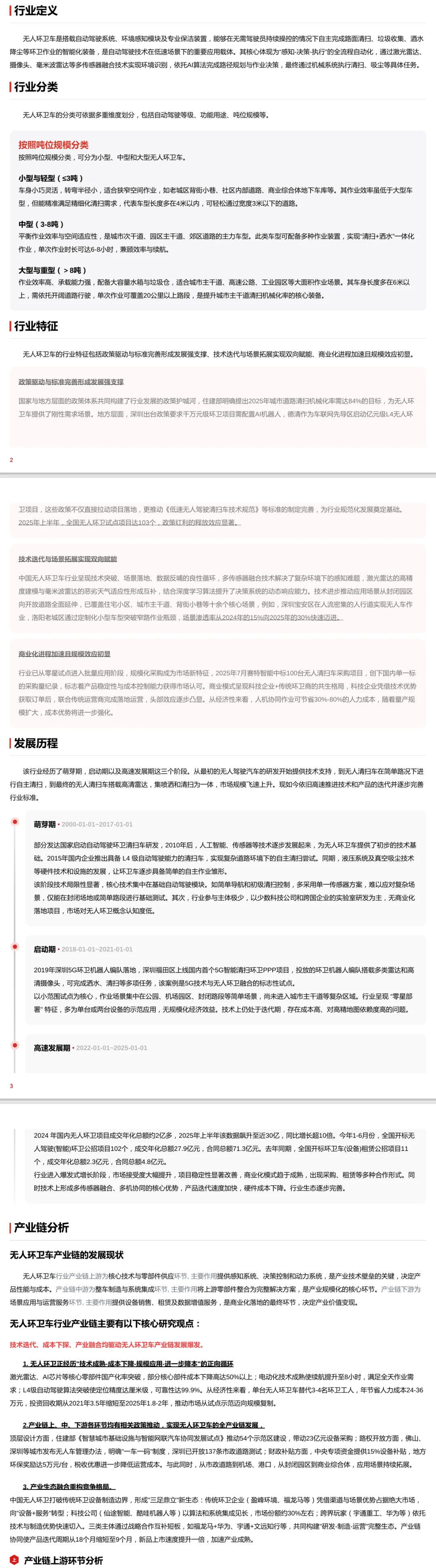 此报告全面解析2025年度无人环卫车行业的发展全貌。无人环卫车是搭载自动驾驶系统与专业保洁装置,可自主完成清扫、垃圾收集等作业的智能化装备,按吨位分为小型、中型、大型三类,适配不同场景需求。行业呈现出政策与标准支撑、技术与场景双向赋能、以及商业化加速的特征,2022-2024年市场规模年复合增长率-0.92%,受技术成本下降和商业模式转型等因素影响缓降,预计在2025-2029年将以11.85%的年复合增长率爆发式增长至111.88亿元。报告深入分析产业链上下游格局:
