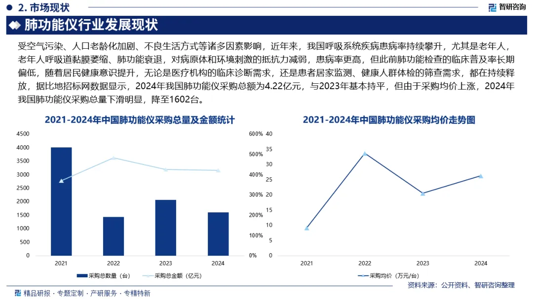 肺功能仪即肺功能测试仪,是用于测量由肺部吸入和呼出的空气体积的一种医疗器械。受空气污染、人口老龄化加剧、不良生活方式等诸多因素影响,近年来,我国呼吸系统疾病患病率持续攀升,尤其是老年人,老年人呼吸道黏膜萎缩、肺功能衰退,对病原体和环境刺激的抵抗力减弱,患病率更高,但此前肺功能检查的临床普及率长期偏低,随着居民健康意识提升,无论是医疗机构的临床诊断需求,还是患者居家监测、健康人群体检的筛查需求,都在持续释放,据比地招标网数据显示,2024年我国肺功能仪采购总额为4.22亿元,与2023年基本持平,但由于采购均价上涨,2024年我国肺功能仪采购总量下滑明显,降至1602台。