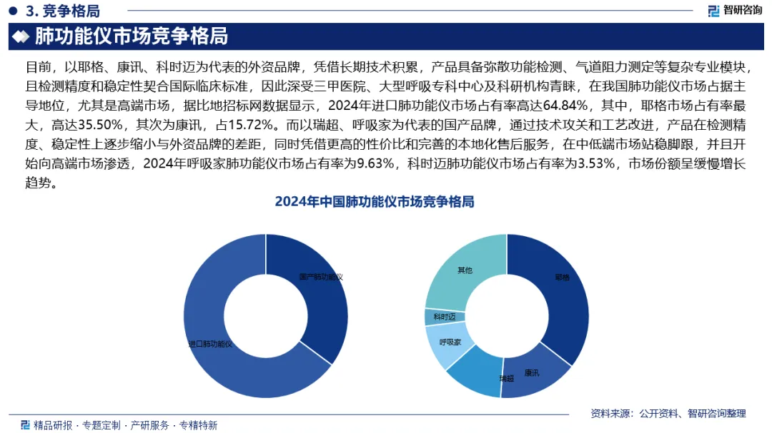 市场竞争格局:目前,以耶格、康讯、科时迈为代表的外资品牌,凭借长期技术积累,产品具备弥散功能检测、气道阻力测定等复杂专业模块,且检测精度和稳定性契合国际临床标准,因此深受三甲医院、大型呼吸专科中心及科研机构青睐,在我国肺功能仪市场占据主导地位,尤其是高端市场,据比地招标网数据显示,2024年进口肺功能仪市场占有率高达64.84%,其中,耶格市场占有率最大,高达35.50%,其次为康讯,占15.72%。