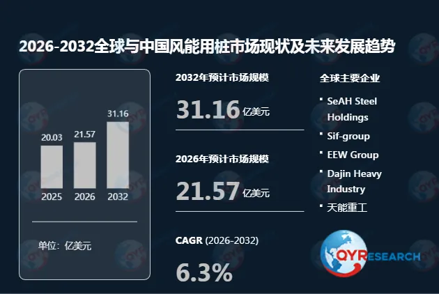 根据QYR(恒州博智)的统计及预测,2025年全球风能用桩市场销售额达到了20.03亿美元,预计2032年将达到31.16亿美元,年复合增长率(CAGR)为6.3%(2026-2032)。