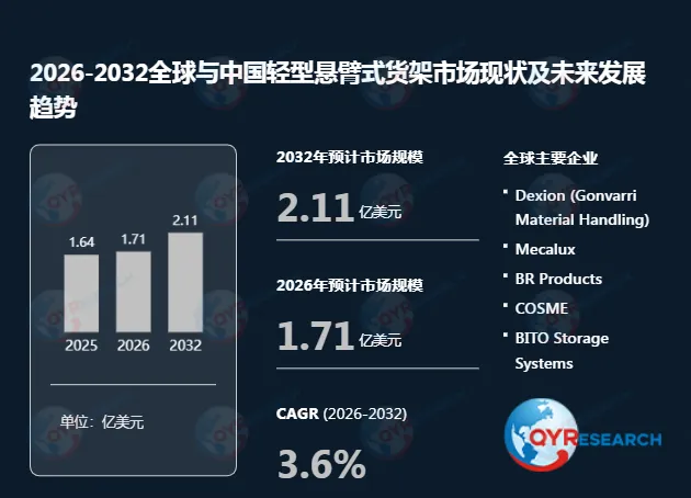根据QYR(恒州博智)的统计及预测,2025年全球轻型悬臂式货架市场销售额达到了1.64亿美元,预计2032年将达到2.11亿美元,年复合增长率(CAGR)为3.6%(2026-2032)。