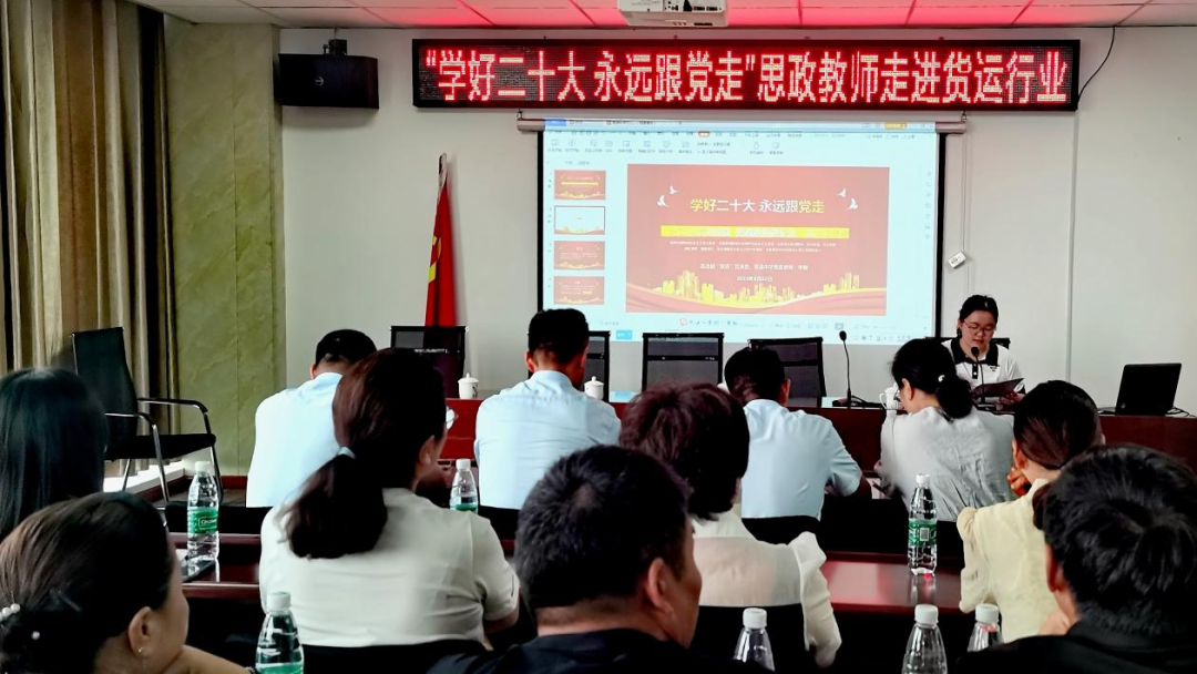 近日,在新沂市宏昌物流有限公司货运行业党群服务中心多功能培训厅,“双进”宣讲团成员、高流中学思政教师李翊以《学好二十大,永远跟党走》为主题,结合货运职工一线生产的实际,用深入浅出的语言,生动详实的例子,解读党的二十大精神。同时对劳模精神、劳动精神、工匠精神进行了讲解,激励职工争当劳模工匠,和党同心同向,与企业共奋进,实现货运工人的价值、成就人生梦想。“李老师讲得很实在,许多话讲到我们心里去了。现代化离不开物流业,只要认真干、踏实干,货车司机也可以成为社会尊重的职业。”徐州市第十届文明职工货车司机崔双喜说。