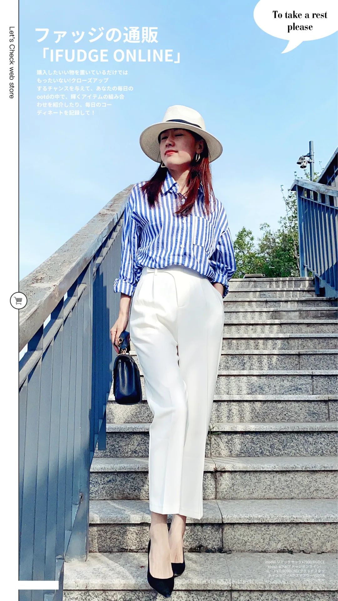 >>>> look5 九分白色那不勒斯裤+蓝白条纹衬衣
