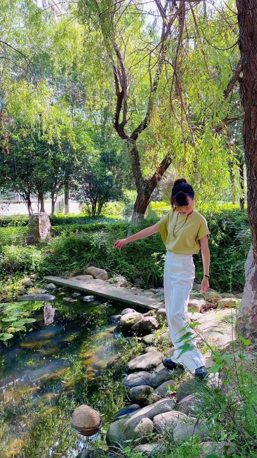 夏日阳光下,白色裤子如同画布一般,将天空的蓝和大地的绿承接,透出悠然自在的气息,像是清泉汩汩。一件与美景相吻合的宽肩T悄悄地在腰部塑造出色彩分界线,走到哪里都吸睛。